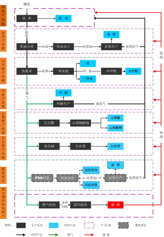 公司集煉焦和化產、煤焦油深加工和炭黑生產、苯加氫和對甲基苯酚生產、泡花堿和白炭黑生產、山梨酸及山梨酸鉀生產、焦爐煤氣制甲醇、燃氣輪機聯合循環熱電聯產等業務于一體,主要產品包括焦炭、炭黑、白炭黑、山梨酸及山梨酸鉀、對甲基苯酚等,下游涉及鋼鐵、輪胎、塑料、化纖、醫藥、食品等行業。